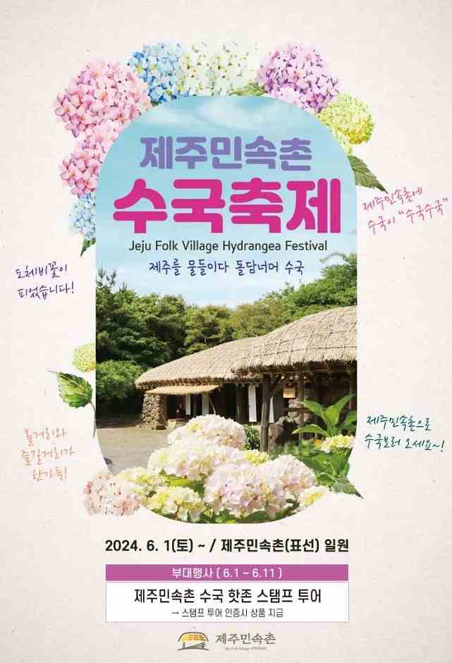 제주민속촌에서는 6월 1일(토)부터 6월 23일(일)까지 ""제주민속촌 수국축제 - 돌담너머수국 제주를 물들이다""을 개최한다.축제기간 동안 민속촌을 방문하면 정성스럽게 가꾼 오색빛깔 파스텔톤의 수국을 제주민속촌 곳곳에서 만날 수 있다.